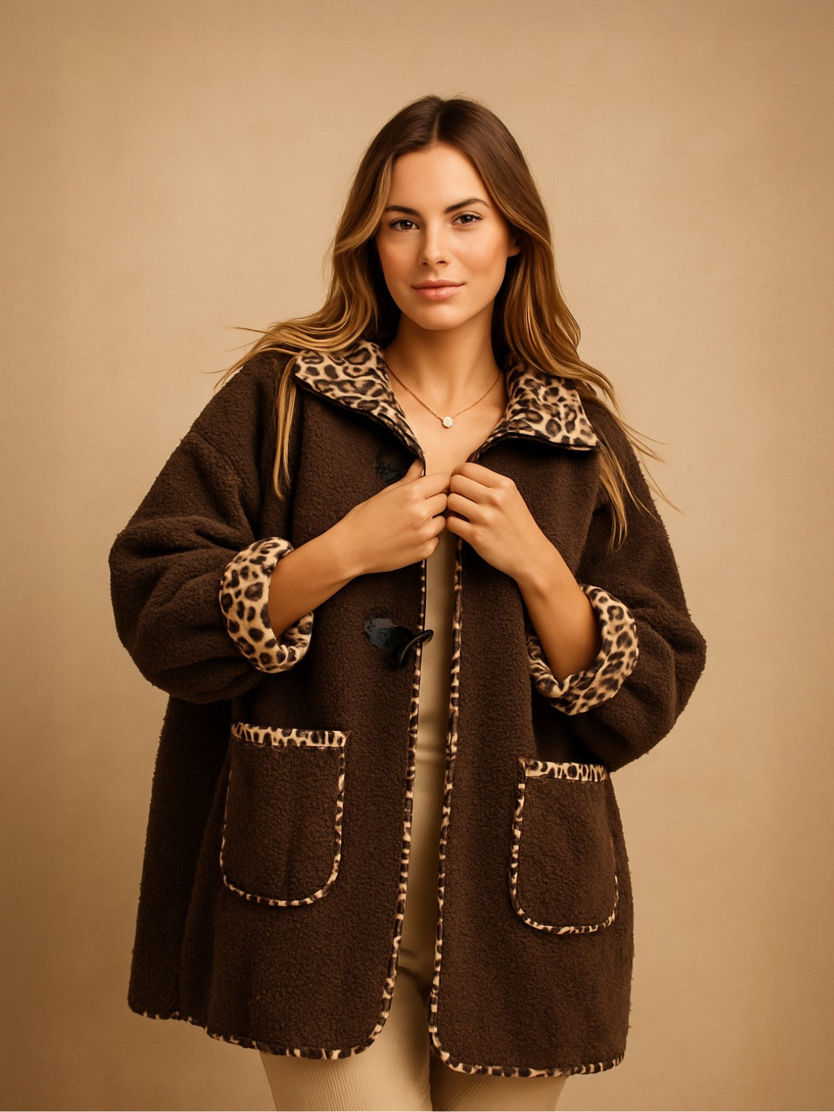 Plüschiger Wintermantel mit Kapuze und Knopfleiste vorne
